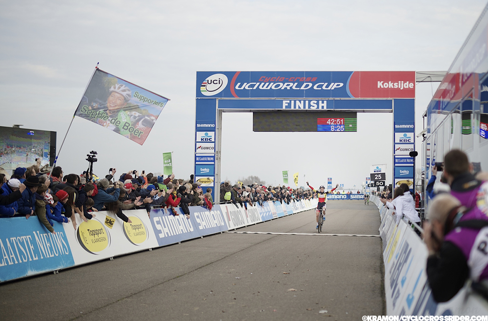 It was Sanne Cant, runner-up to Compton here twelve months ago, who took most advantage to win today’s race over the Koksijde dunes, but it is third placed Sophie de Boer who takes the American’s World Cup leader’s jersey.