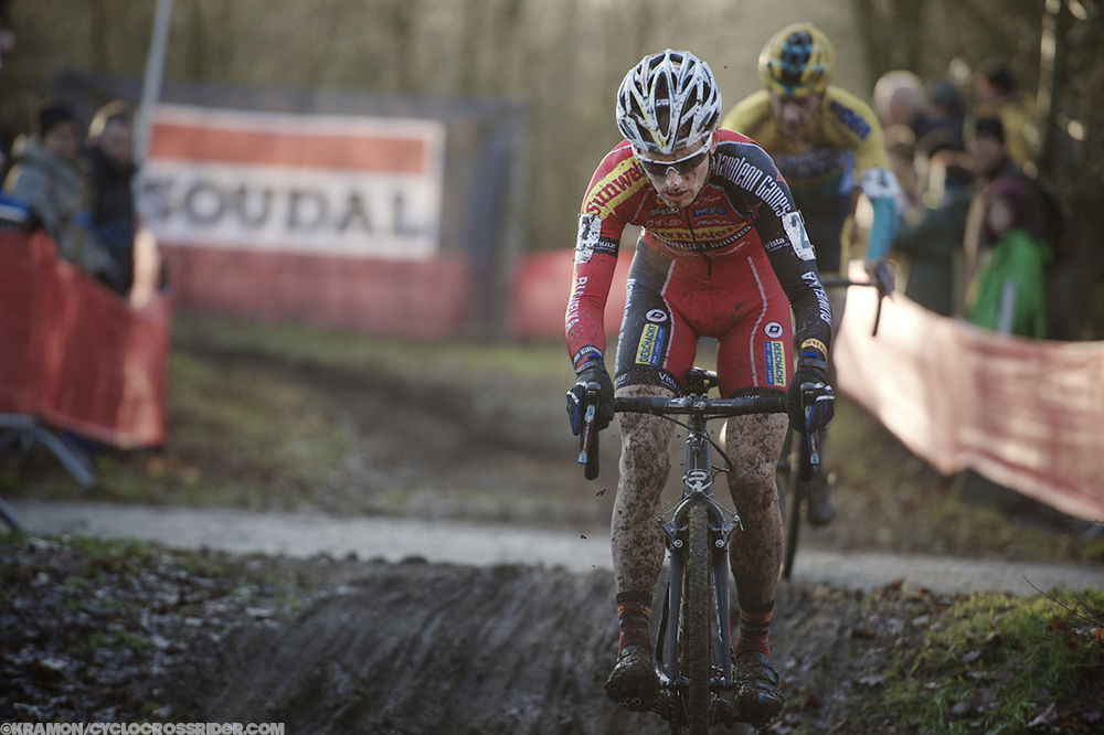 At the bell, Sweeck, Pauwels and Meeusen were still together and the battle for first placed Belgian was on. Meeusen, third in line, was momentarily slowed by Pauwels and forced to put a foot down as Sweeck pushed on to try and take advantage. Sweeck could not sustain his attack though, sat up and all three of them came back together before he launched another attack past the pits.